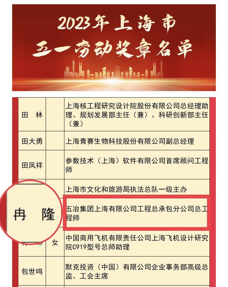 4月27日,2023年上海市五一劳动奖表彰大会在上海友谊会堂隆重举行,开云官方注册工程总承包分公司总工程师冉隆同志荣获上海市五一劳动奖章。